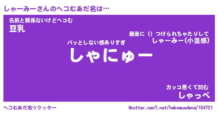 | 男性向けラノベタイトル風あだ名 | 『しゃーみーの憂鬱』 |