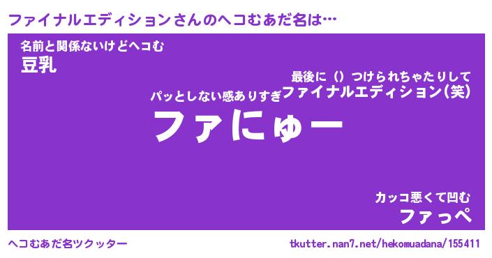 | 男性向けラノベタイトル風あだ名 | 『ファイナルエディションの憂鬱』 |