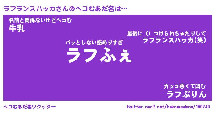 | 2回繰り返すあだ名 | 『ラフラフ』『ララフフ』『ぎょぎょ』 |
