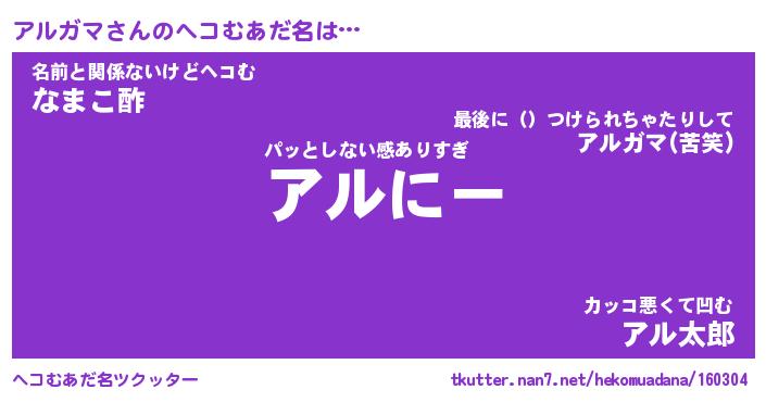 | 男性向けラノベタイトル風あだ名 | 『アルガマの憂鬱』 |