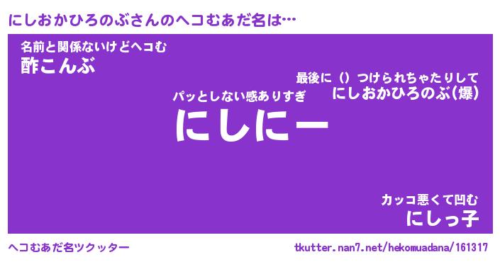 | 男性向けラノベタイトル風あだ名 | 『にしおかひろのぶの憂鬱』 |