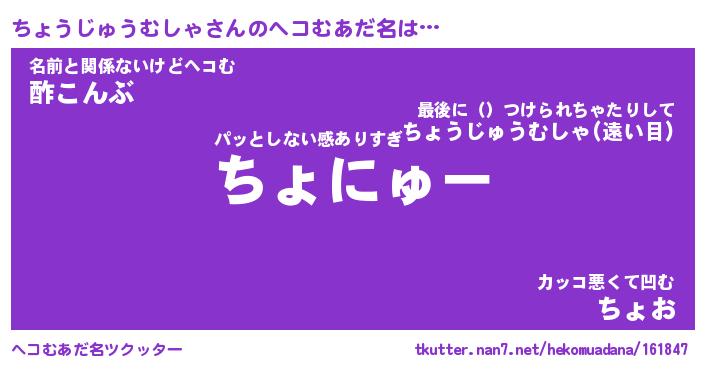 | 男性向けラノベタイトル風あだ名 | 『ちょうじゅうむしゃの憂鬱』 |