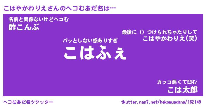 | 恥ずかしいあだ名 | 『プリティーこはやかわりえ』『こはちん』 |