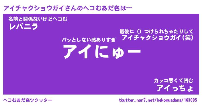 | 男性向けラノベタイトル風あだ名 | 『アイチャクショウガイの憂鬱』 |