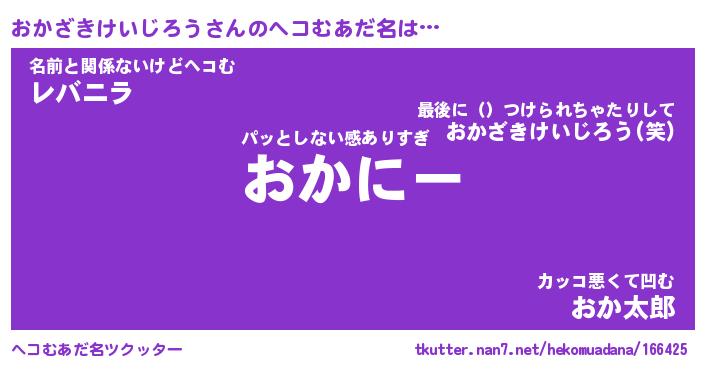 | 胡散臭い通販商品みたいなあだ名 | 『億万長者になれるブレスレット…その名も「おかざきけいじろう」』 |