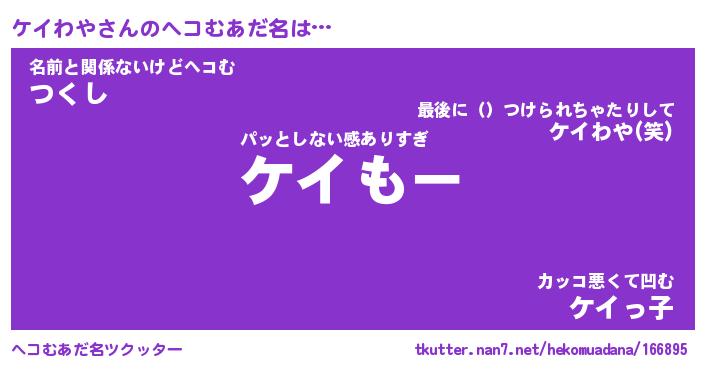 | 意味不明あだ名 | 『ペロリンケイわや』『永久保存ケイわや』 |