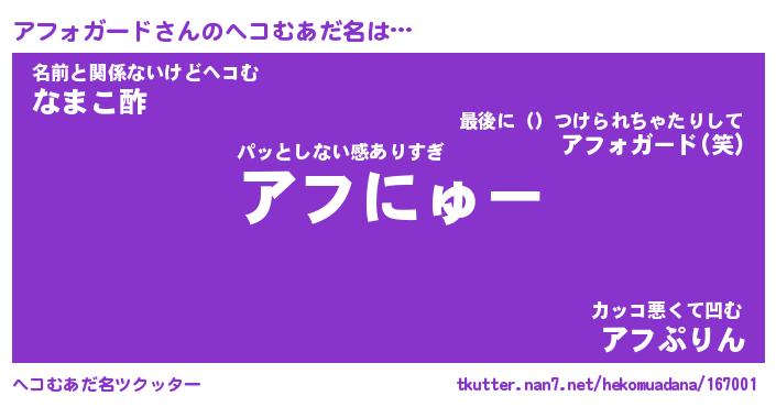 | ヒーロー風カッコイイあだ名 | 『スーパーアフォガード』『幻影騎士アフ』 |