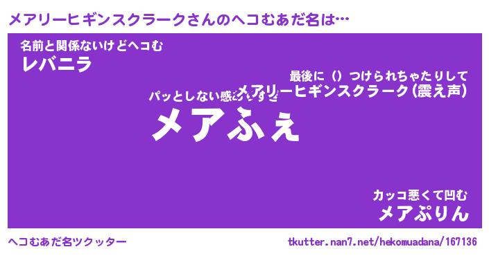 | 意味不明あだ名 | 『ペロリンメアリーヒギンスクラーク』 |