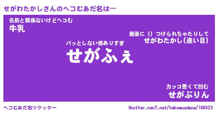 | 2回繰り返すあだ名 | 『せがせが』『せせがが』『ぬれぬれ』 |