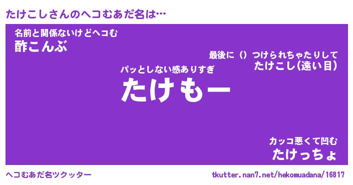 | 意味不明あだ名 | 『ペロリンたけこし』『永久保存たけこし』 |
