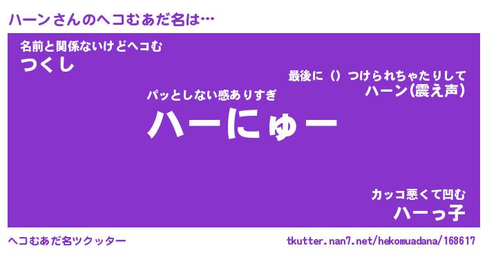 | ポケモン風あだ名 | 『ハーチュウ』『ハーンダネ』 |