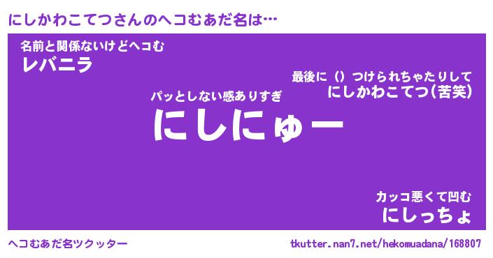 | ポケモン風あだ名 | 『ニシチュウ』『ニシカダネ』 |