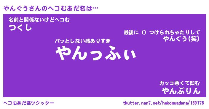 | 意味不明あだ名 | 『ペロリンやんぐう』『永久保存やんぐう』 |