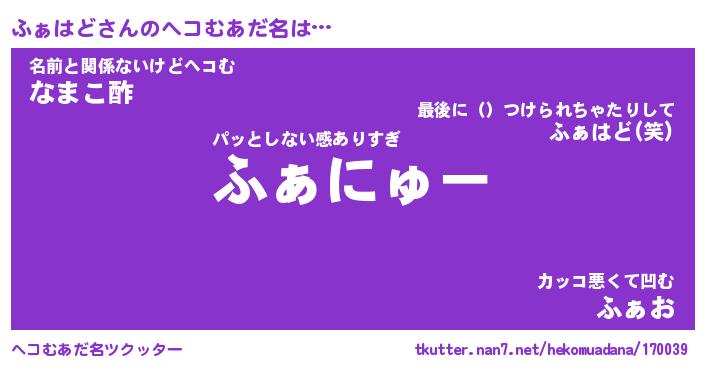 | 2回繰り返すあだ名 | 『ふぁふぁ』『ふふぁぁ』『うねうね』 |