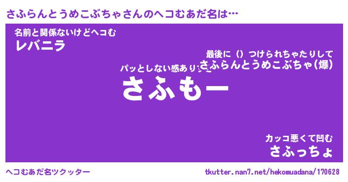 | 男性向けラノベタイトル風あだ名 | 『サフラントウメコブチャアートオンライン』 |