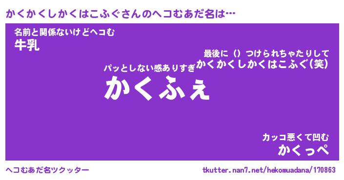 | 男性向けラノベタイトル風あだ名 | 『かくかくしかくはこふぐの憂鬱』 |