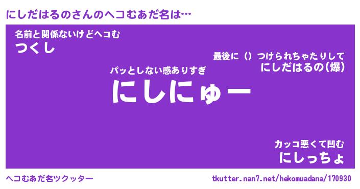 | ヒーロー風カッコイイあだ名 | 『スーパーニシダハルノ』『銀牙騎士ニシ』 |