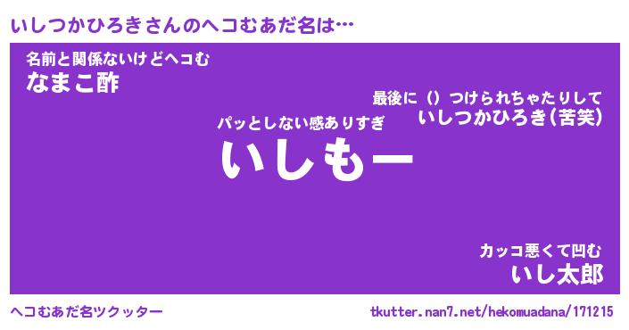 | 恥ずかしいあだ名 | 『プリティーいしつかひろき』『いしちん』 |