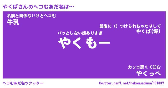 | 意味不明あだ名 | 『ペロリンやくば』『やくばフォーエバー』 |