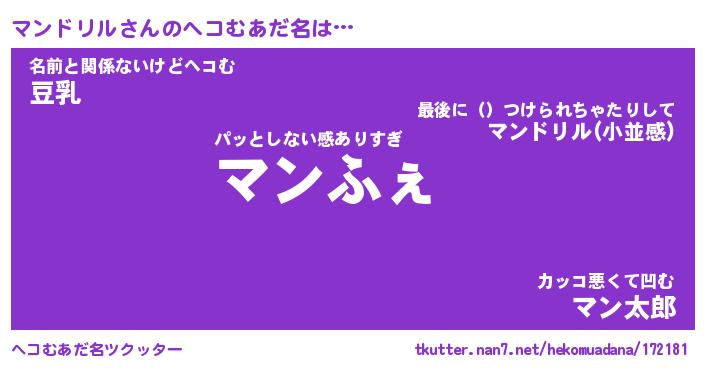| 男性向けラノベタイトル風あだ名 | 『マンドリルの憂鬱』 |