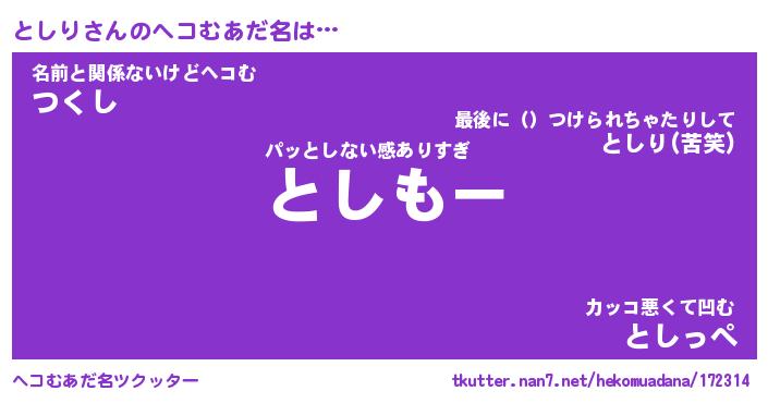 | 男性向けラノベタイトル風あだ名 | 『としりの憂鬱』 |