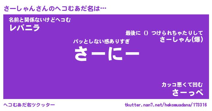 | 男性向けラノベタイトル風あだ名 | 『さーしゃんの憂鬱』 |