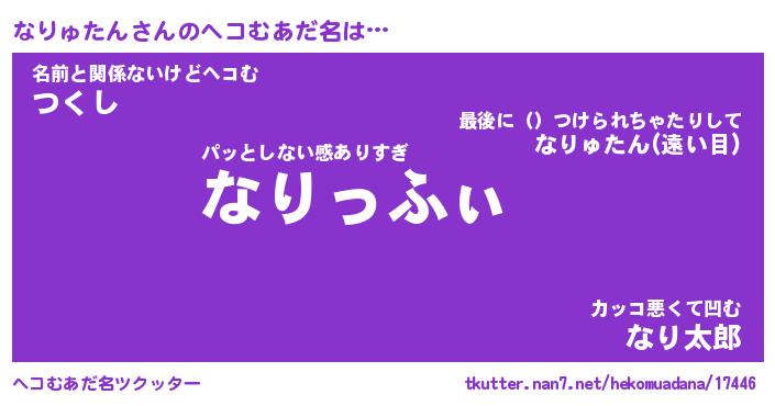 | 男性向けラノベタイトル風あだ名 | 『なりゅたんの憂鬱』 |