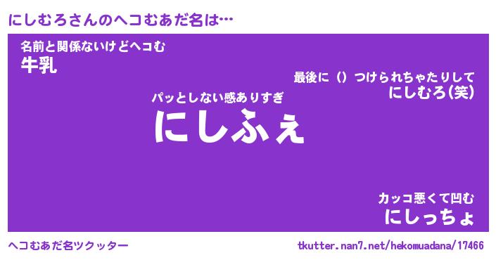 | 意味不明あだ名 | 『ペロリンにしむろ』『永久保存にしむろ』 |