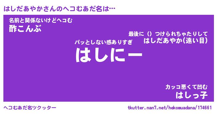 | 恥ずかしいあだ名 | 『プリティーはしだあやか』『はしっちょ』 |