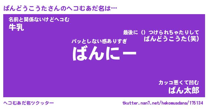 | 恥ずかしいあだ名 | 『プリティーばんどうこうた』『ばんちん』 |
