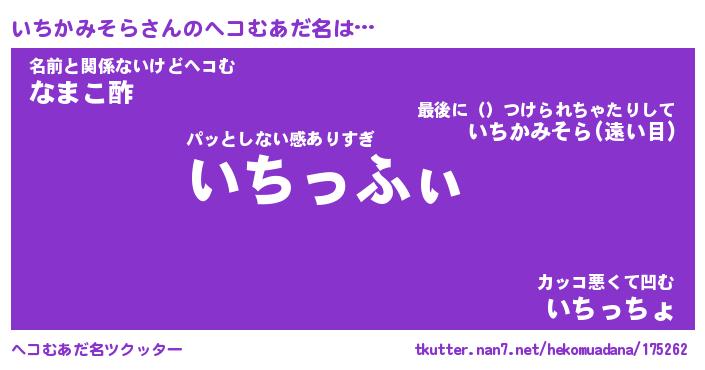 | ヒーロー風カッコイイあだ名 | 『スーパーイチカミソラ』『魔戒騎士イチ』 |
