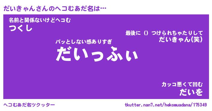 | 男性向けラノベタイトル風あだ名 | 『だいきゃんの憂鬱』 |
