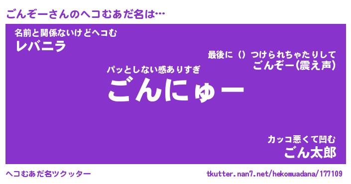 | 意味不明あだ名 | 『ペロリンごんぞー』『永久保存ごんぞー』 |