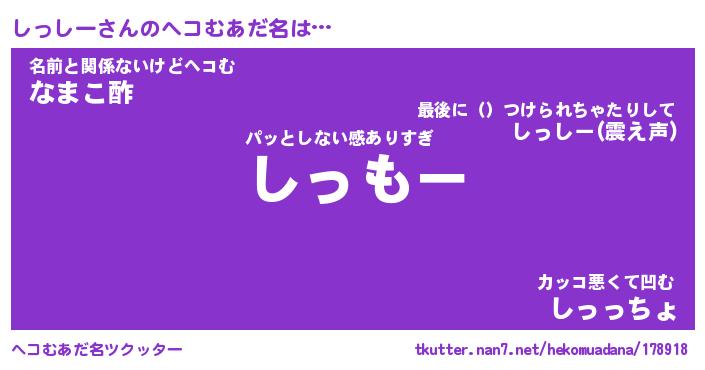 | 意味不明あだ名 | 『ペロリンしっしー』『永久保存しっしー』 |