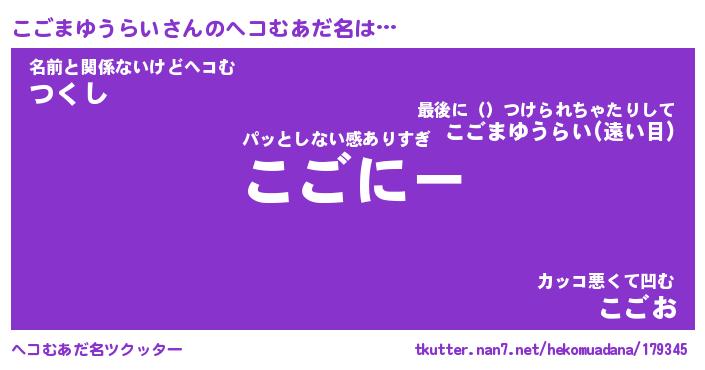 | 男性向けラノベタイトル風あだ名 | 『こごまゆうらいの憂鬱』 |