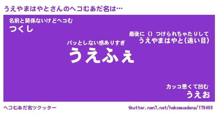 | 恥ずかしいあだ名 | 『プリティーうえやまはやと』『うえちん』 |