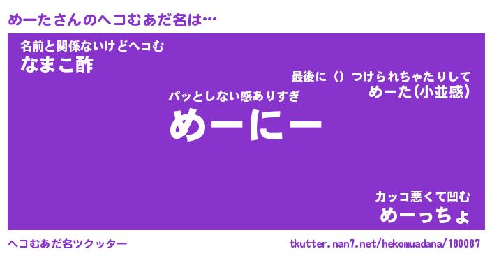 | 意味不明あだ名 | 『ペロリンめーた』『めーたフォーエバー』 |