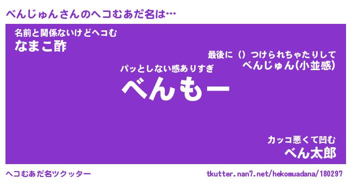 | 男性向けラノベタイトル風あだ名 | 『べんじゅんの憂鬱』 |