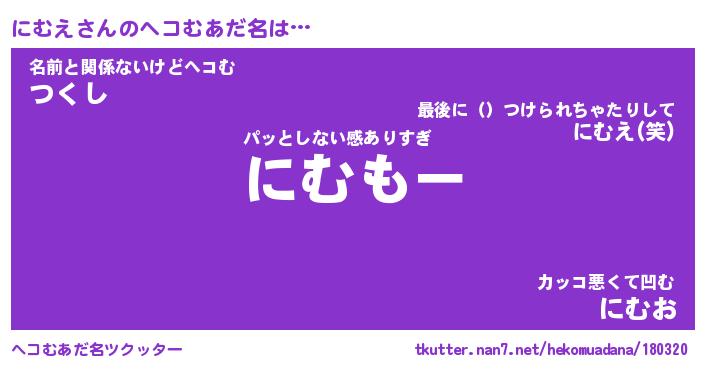| 意味不明あだ名 | 『ペロリンにむえ』『にむえフォーエバー』 |