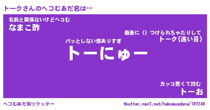 | 男性向けラノベタイトル風あだ名 | 『トークの憂鬱』 |