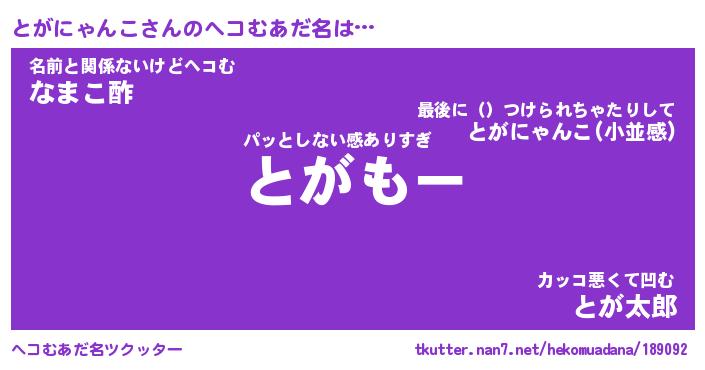 | 男性向けラノベタイトル風あだ名 | 『とがにゃんこの憂鬱』 |
