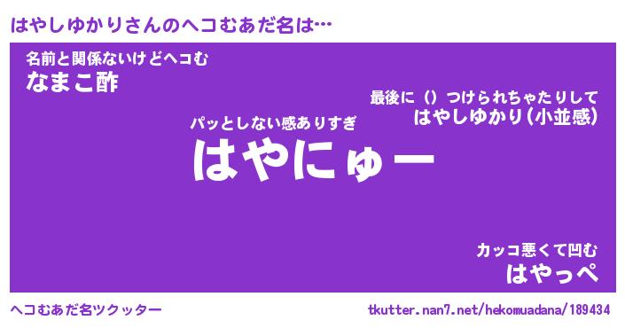| 恥ずかしいあだ名 | 『プリティーはやしゆかり』『はやっちょ』 |