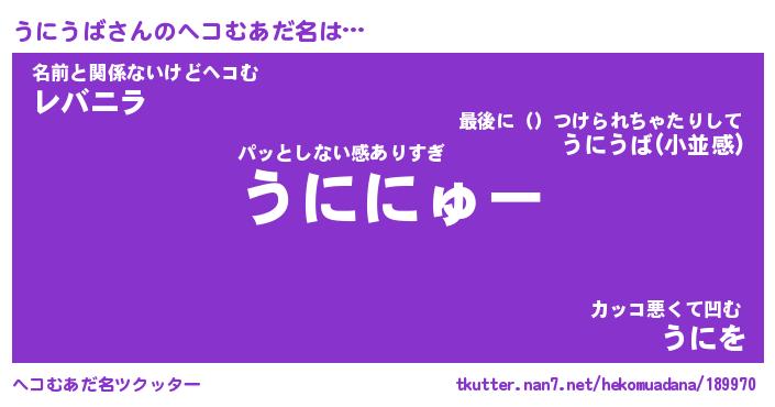| 意味不明あだ名 | 『ペロリンうにうば』『永久保存うにうば』 |