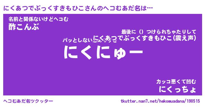 | 男性向けラノベタイトル風あだ名 | 『にくあつでぶっくすきもひこの憂鬱』 |