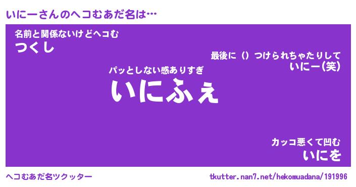 | 意味不明あだ名 | 『ペロリンいにー』『いにーフォーエバー』 |