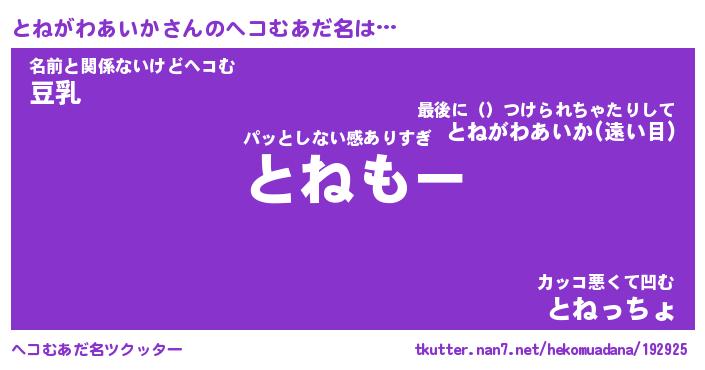 | 2回繰り返すあだ名 | 『とねとね』『ととねね』『ぶすぶす』 |