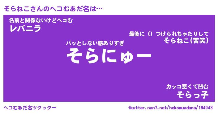 | 欧米人風あだ名 | 『マイケルそらねこ』『ウサインそらねこ』 |