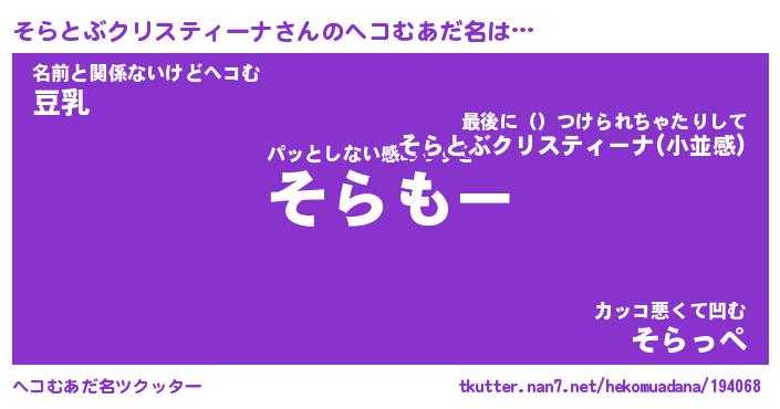 | 男性向けラノベタイトル風あだ名 | 『そらとぶクリスティーナの憂鬱』 |
