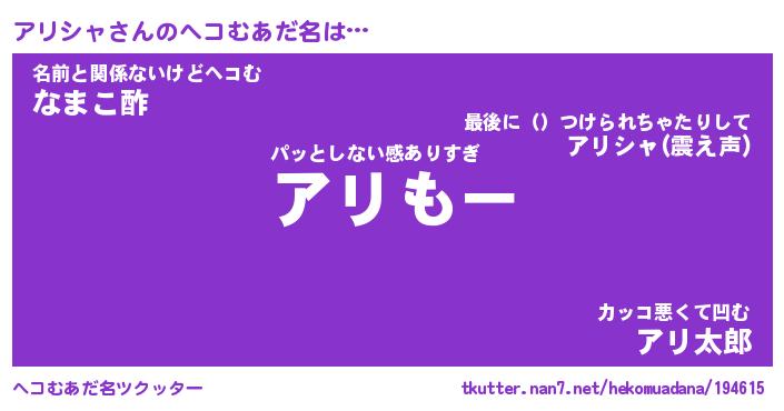 | 意味不明あだ名 | 『ペロリンアリシャ』『永久保存アリシャ』 |
