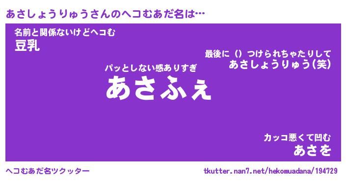 | 男性向けラノベタイトル風あだ名 | 『アサショウリュウアートオンライン』 |